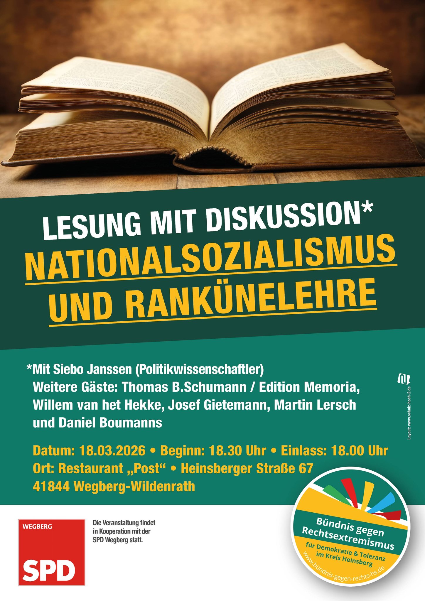„Das Bündnis gegen Rechts, für Demokratie und Toleranz im Kreis Heinsberg steht für eine offene, tolerante und demokratische Gesellschaft. Wir veröffentlichen unsere Stellungnahmen zu Gedenktagen und zu antisemitischen, volksverhetzenden und fremdenfeindlichen Aktionen jeder Art. Und so geht die Frage an euch, wollen wir eine freiheitlich demokratische Gesellschaft? Ja, wir wollen dieses! Wollen wir, dass alle Menschen, gleich welchen Pass sie haben, ob sie Arbeit haben oder nicht, sich bei uns wohl und sicher fühlen können? Ja dieses wollen wir! Wollen wir, dass alle